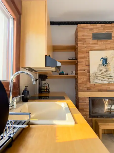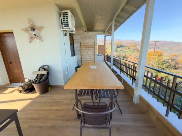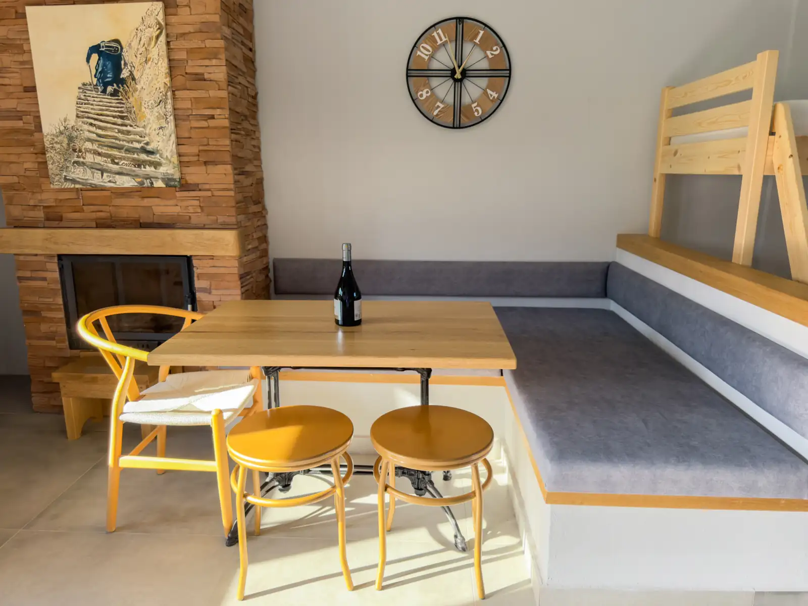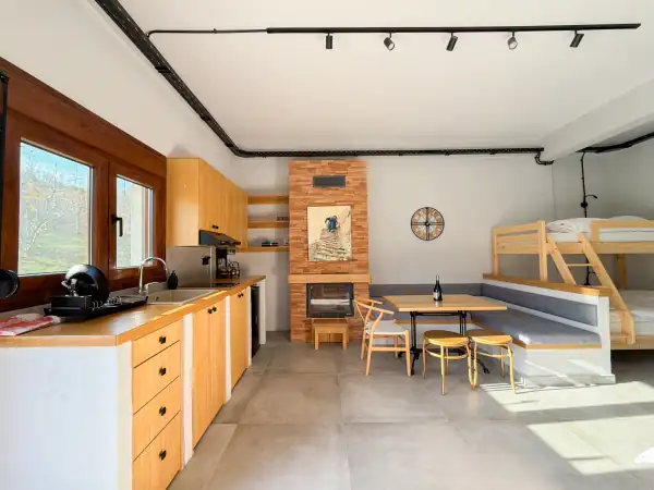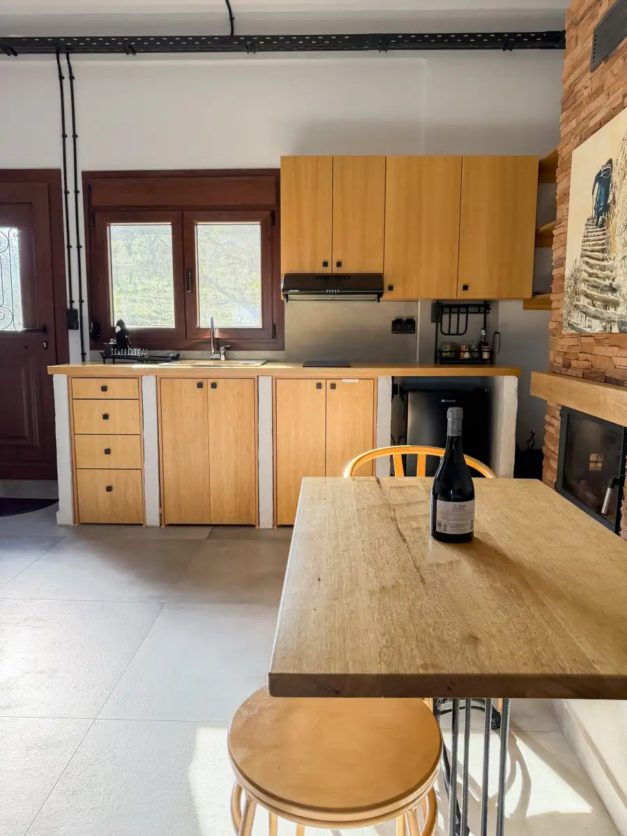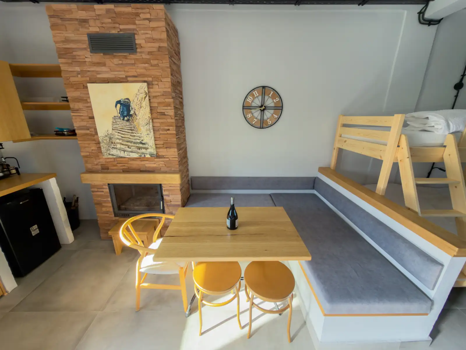 Δίπλα στο τζάκι και την κουζίνα ένα φιλόξενο τραπέζι από μασίφ ξύλο είναι έτοιμο να δεχτεί τα πιο ξεχωριστά γεύματα που οι επισκέπτες μπορούν να ετοιμάσουν στον χώρο του καταλύματος ή στο εξωτερικό μπάρμπεκιου.