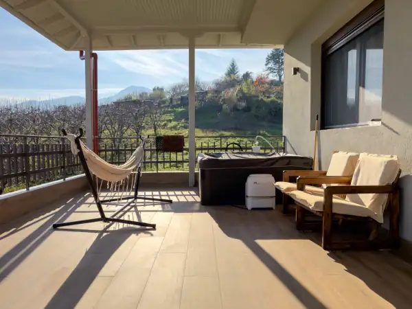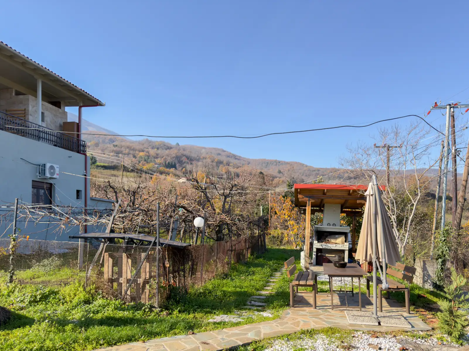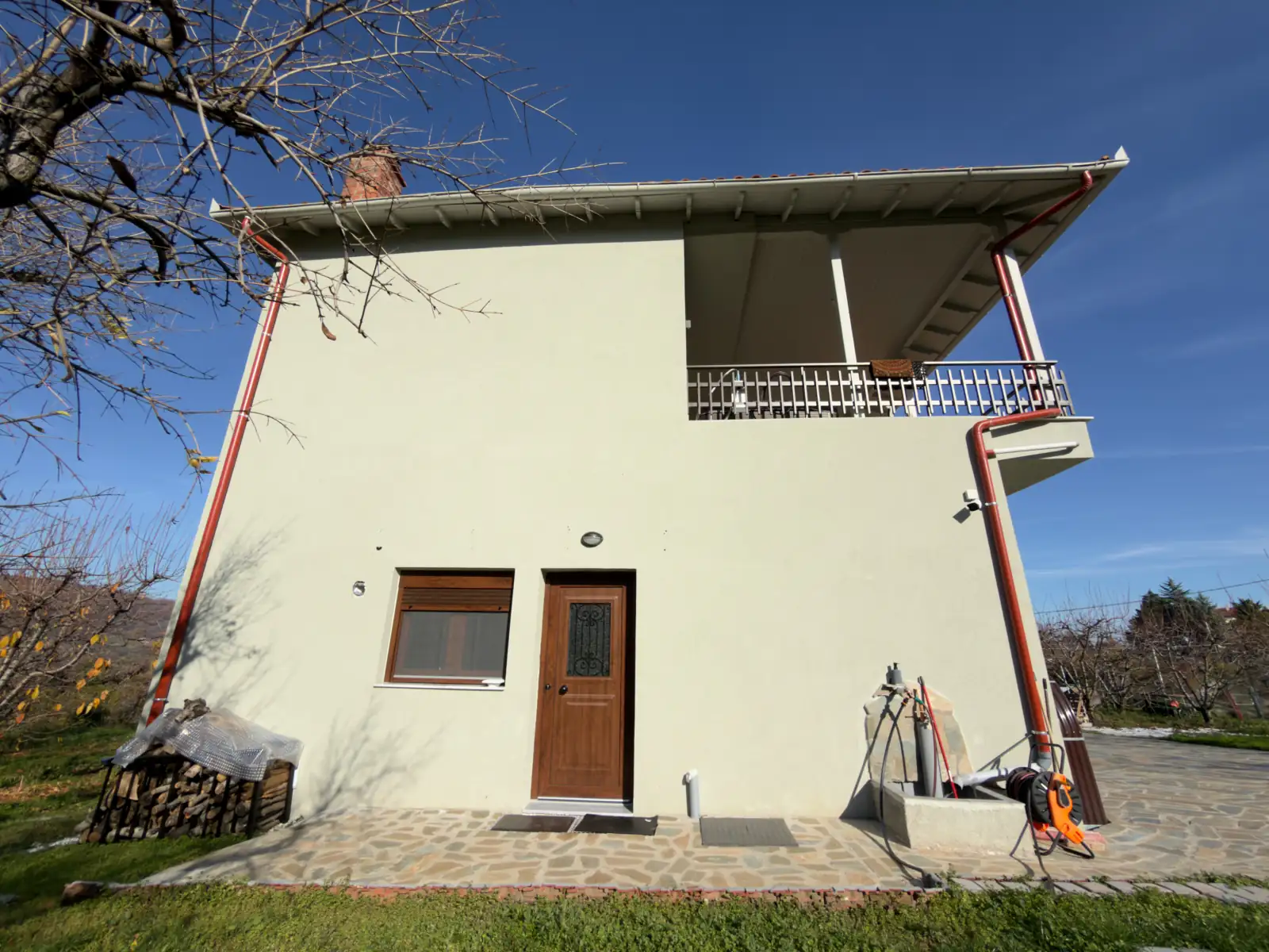 Από το ένα παράθυρο φαίνεται ο οπωρώνας με τις κερασιές και το βουνό Βέρμιο, ενώ από το άλλο παράθυρο φαίνεται ο αμπελώνας και το βουνό Πάικο.